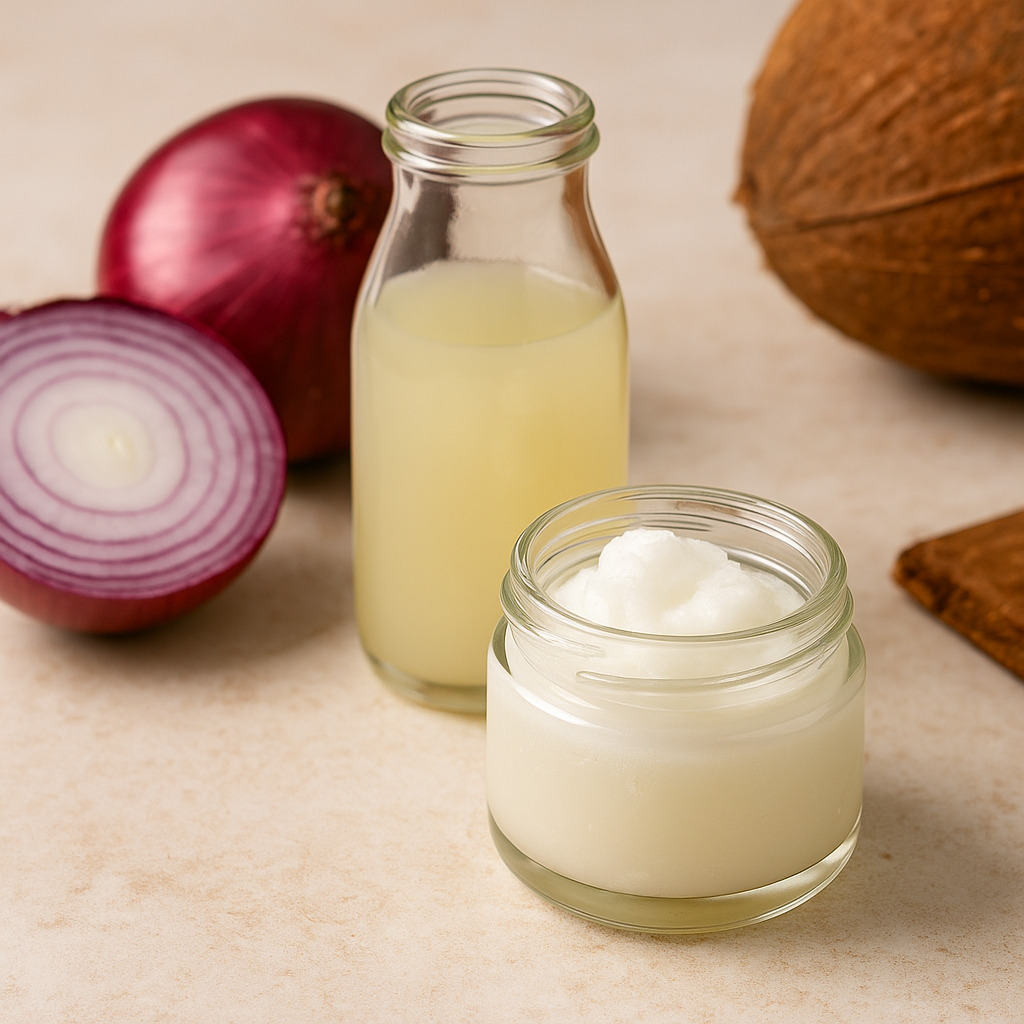 Many people swear by onion juice for faster growth and reduced thinning. Coconut oil is one of the few oils that penetrates deep into the hair shaft, preventing protein loss and nourishing from within.
