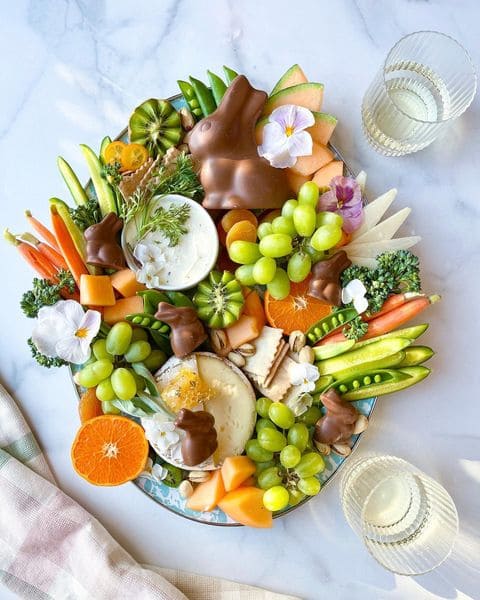 On Easter morning, a giant round grazing board like this becomes the whole party plan in one move.