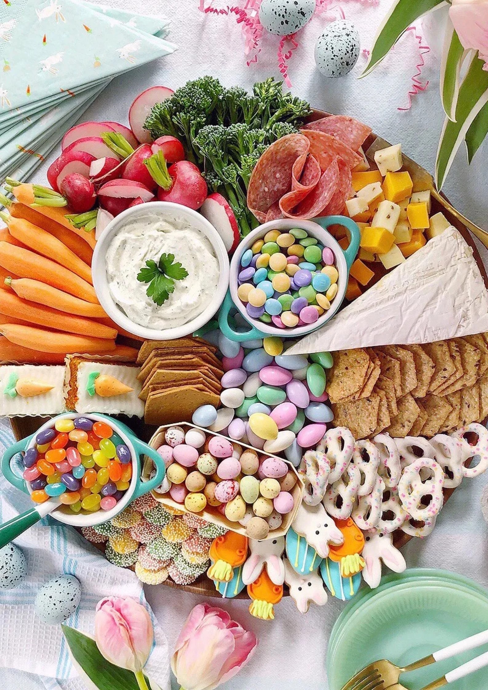 Your Easter table gets an instant upgrade with this colorful mix of sweet treats, fresh veggies, and creamy cheeses. Bright carrots, radishes, and broccolini balance out the candy bowls so the board feels fun but not overloaded with sugar.