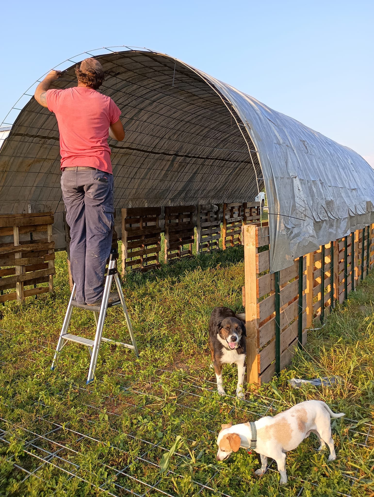 Finally, I stretched the agricultural tarp over the frame. I made sure to pull it tight to avoid sagging, especially in the middle where rain could gather.