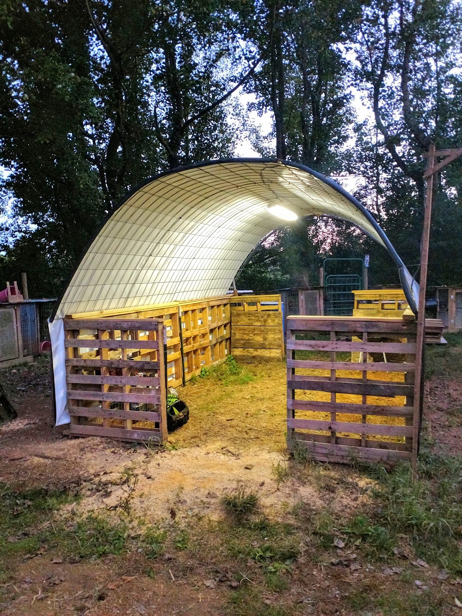 The walkthrough design means I don’t have to squeeze in or out, which is especially handy when I’m hauling things in and out. The cattle panels provide a great structure for walls, and the tarp roof keeps everything inside safe from the weather.